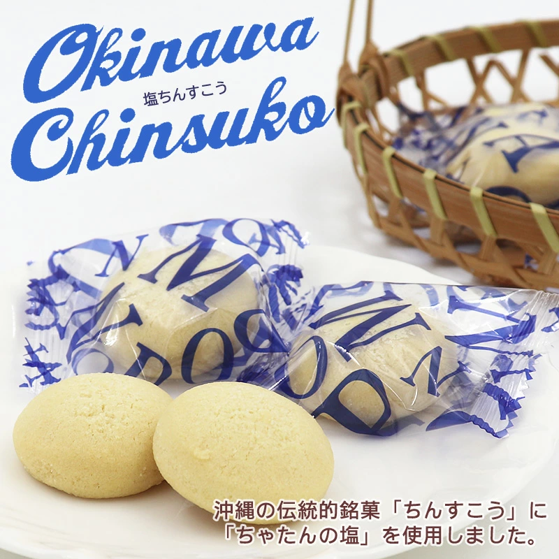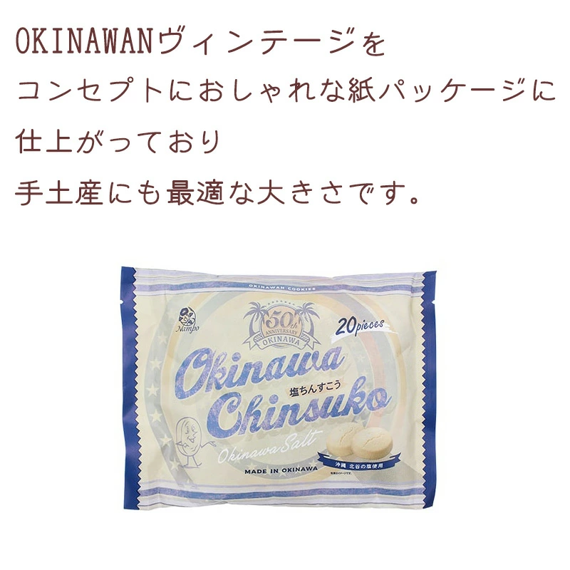 「ちゃたんの塩」を使用したちんすこうです。 1口サイズにまぁるく焼き上げました。 OKINAWANヴィンテージをコンセプトにしたおしゃれな紙パッケージです。