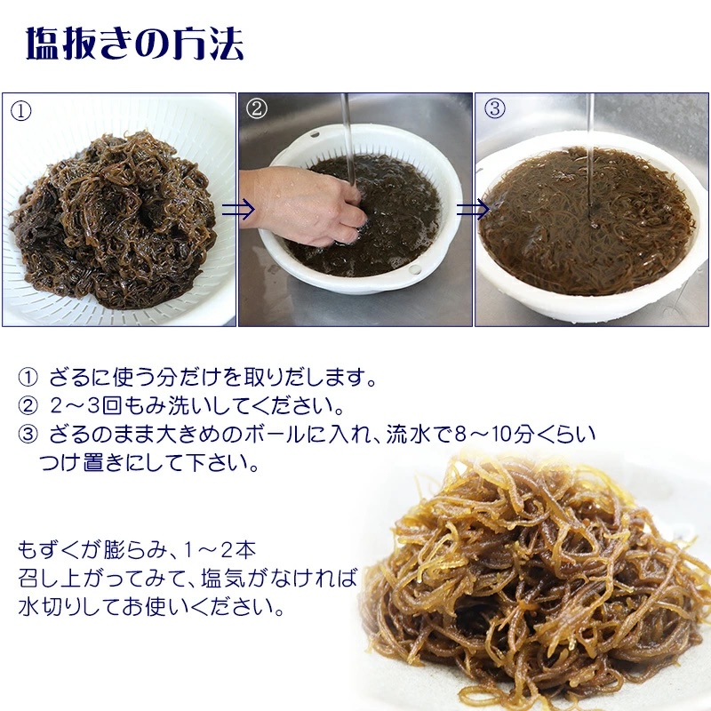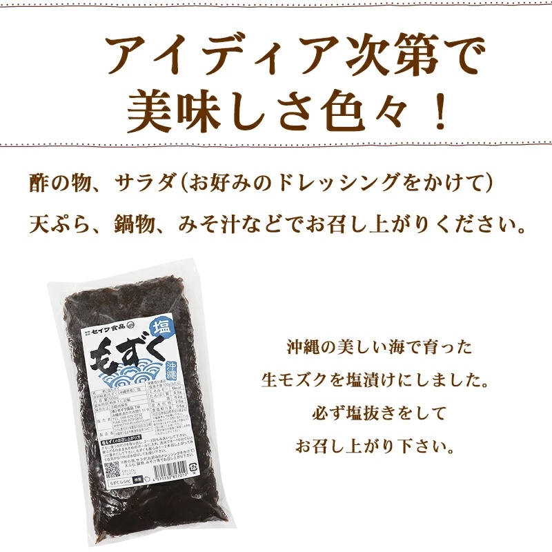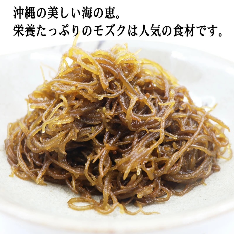 沖縄の美しい海の恵み。モズク。 フコイダンたっぷりで健康志向の方にも人気です。 酢の物、サラダ(お好みのドレッシングをかけて)天ぷら、鍋物、みそ汁などでお召し上がりください。